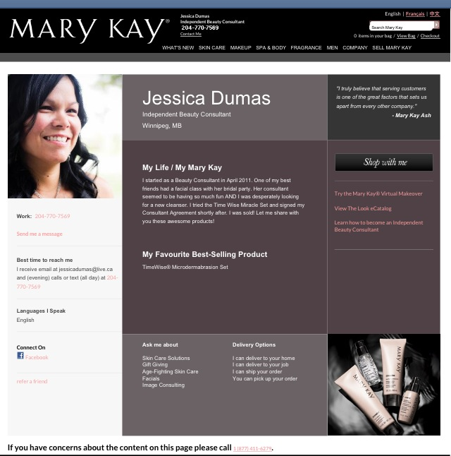 Check out my new 24/7 website www.marykay.ca/JessicaDumas for awesome products & recruitment information, also feel free to contact me to set up a skin care class or free facial. Credit cards accepted.