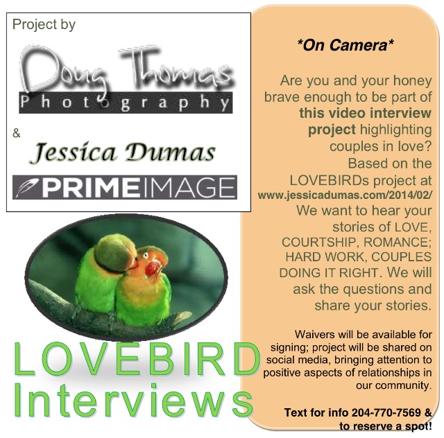Project LOVEBIRDs 2015 has begun. My friend and amazing Photographer and Videographer, Doug Thomas (and my previous Lovebirds project participant with beautiful wife Tracey. http://www.jessicadumas.com/2014/02/) is joining me as I seek your love stories for a recorded version! If you are interested or know someone you would recommend, let me know! Text 204-770-7569 or send me a message at jessicadumas.com